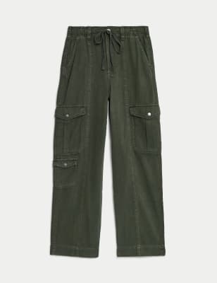 These twill cargo trousers are made from a blend of cotton and lyocell™ for a supersoft and breathable feel. Easy regular fit, with a comfy drawstring fastening at the high waist. A selection of pockets make this pair a practical choice.n M&S Collection: easy-to-wear wardrobe staples that combine classic and contemporary styles.