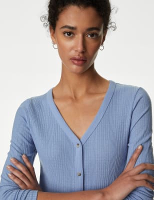 This cotton-rich cardigan features a ribbed design for a touch of texture. It's crafted in a regular fit, with a neat v-neckline and a button-through front. n M&S Collection: easy-to-wear wardrobe staples that combine classic and contemporary styles.
