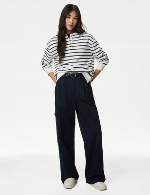 These cargo trousers are made from breathable cotton-rich fabric with added stretch for comfort. Standard fit, with a flattering wide-leg shape featuring pleats for added drape. The high waist is complete with a concealed button and zip fastening that gives a clean, smart look. Handy side pockets and cargo pockets on the thighs provide plenty of storage space. nM&S Collection: easy-to-wear wardrobe staples that combine classic and contemporary styles.