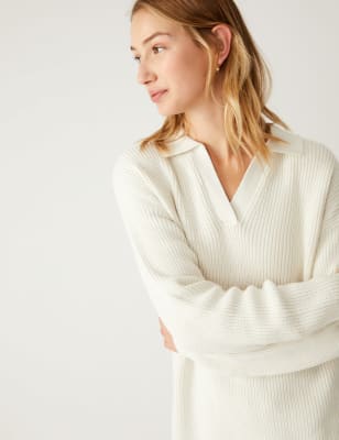 Womens M&S Collection Cotton Rich Ribbed Collared Relaxed Jumper - Ivory, Ivory