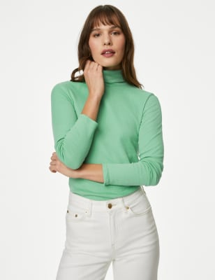 Womens M&S Collection Cotton Rich Roll Neck Ribbed Top - Leaf, Leaf
