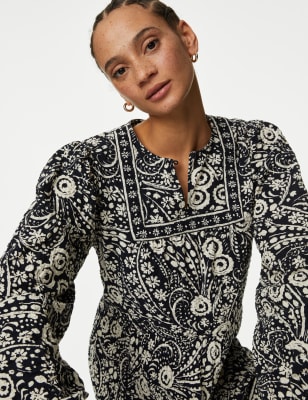 This textured dress is crafted from cotton-rich fabric for a lightweight and breathable feel. It's cut in a regular fit, with an all-over print and tiered mini skirt for a striking look. It features a yoke detail with a button fastening to give a smart touch. The long sleeves have elasticated cuffs for a comfortable feel, while an easy round neck provides the finish.nM&S Collection: easy-to-wear wardrobe staples that combine classic and contemporary styles.