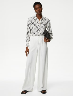 For striking shaping, reach for these lightweight crepe trousers. Wide leg design for a breezy feel. An elasticated high waist and drawstring fastening create a comfortable fit. Two concealed side pockets for keeping essentials close and mock back pockets for a dash of detail. n M&S Collection: easy-to-wear wardrobe staples that combine classic and contemporary styles.