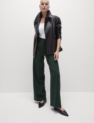 Perfect for dressier occasions, these crepe trousers have an elegant silhouette. Flattering design with a wide leg and high waist. Belt loops, front darts and pressed creases create a smart tailored look. Practical touches include side pockets and added stretch in the fabric. Finished on the back with a stylish buckle tab detail at the waist and two mock welt pockets.n M&S Collection: easy-to-wear wardrobe staples that combine classic and contemporary styles.