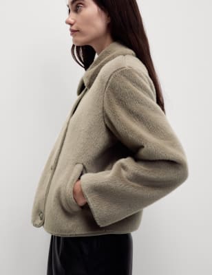 This contemporary jacket is made from faux fur for an extra-cosy feel. It's designed in an easy regular fit, with a short length which makes it easy to layer. The authentic mock horn buttons securely fasten the front, while the furry collared neckline adds extra warmth and comfort. Two welt pockets are ideal for carrying your essentials.n M&S Collection: easy-to-wear wardrobe staples that combine classic and contemporary styles.