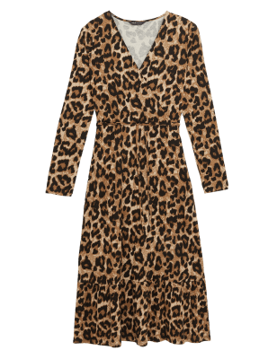 The long sleeves on this printed jersey tea dress make it perfect for colder days. The regular fit piece falls to a classic midi length. It features a v-neck and a mock wrap front, complete with a tie belt that nips in the waist for a flattering silhouette. Added stretch makes it extra comfy, while a tiered hem gives a feminine finish.n M&S Collection: easy-to-wear wardrobe staples that combine classic and contemporary styles.