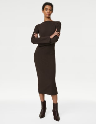Look effortlessly put together in this stylish jersey dress. This midi-length piece comes in a comfortable regular fit, with a flattering column silhouette and added stretch in the ribbed fabric for easy movement. It's complete with a slash neckline for modern appeal and long sleeves that are slightly flared at the cuff.n M&S Collection: easy-to-wear wardrobe staples that combine classic and contemporary styles.