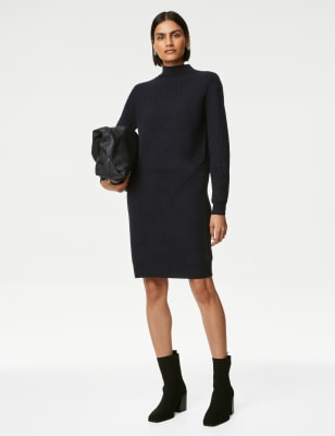 Womens M&S Collection Knitted Ribbed Funnel Neck Mini Dress - Navy, Navy