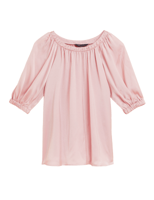 Achieve an effortlessly elegant look in our classic short sleeve blouse. Cut to a regular fit, with a discreet button fastening on the back. Elasticated cuffs add subtle volume to the sleeves. The round neckline is gathered, allowing the fabric to drape for a flattering silhouette. n M&S Collection: easy-to-wear wardrobe staples that combine classic and contemporary styles.