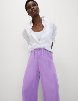 These linen-rich trousers are designed in a breezy wide-leg shape, making them perfect for warm-weather days. They fasten with a drawstring at the comfortable high rise waist. Handy side pockets and patch pockets at the back complete this practical pair. n M&S Collection: easy-to-wear wardrobe staples that combine classic and contemporary styles.