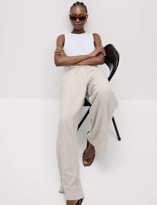 These linen-rich trousers are designed in a breezy wide-leg shape, making them perfect for warm-weather days. They fasten with a drawstring at the comfortable high rise waist. Handy side pockets and patch pockets at the back complete this practical pair. n M&S Collection: easy-to-wear wardrobe staples that combine classic and contemporary styles.