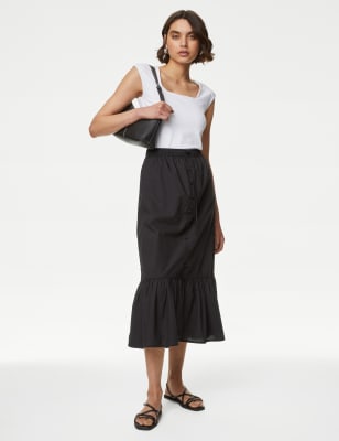 This understated skirt makes a timeless addition to your smart-casual wardrobe. It's made from airy pure cotton, featuring a drawstring fastening at the waist for a comfortable fit. The tiered shape provides a flattering feel, while the midi length hem creates a classic look. Its button-through front gives a neat finish.n M&S Collection: easy-to-wear wardrobe staples that combine classic and contemporary styles.