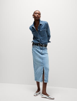 Update your denim collection with this cotton-rich midi skirt. The classic five-pocket design has a flattering high waist with a button-and-zip fastening. A touch of stretch in the fabric and a split opening at the front ensure easy movement. n M&S Collection: easy-to-wear wardrobe staples that combine classic and contemporary styles.