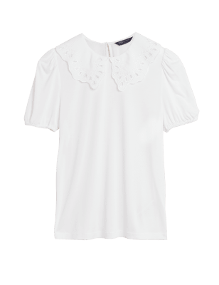 Playful touches give this modal-rich top a fun feel. It's cut in a regular fit with short puff sleeves for a hint of volume. The oversized Peter Pan collar features cut-out sections and embroidery for a dash of detail. n M&S Collection: easy-to-wear wardrobe staples that combine classic and contemporary styles.