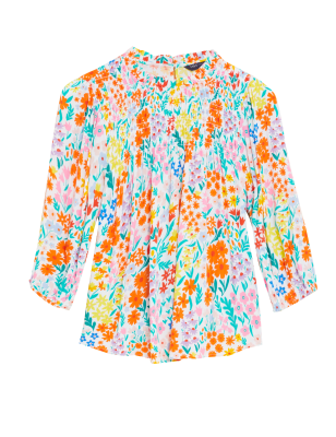 A smocked high neck and 3/4 sleeves give this printed blouse a flattering silhouette. Regular fit, with a back button fastening. Soft-touch material for comfort. Made with responsibly sourced viscose.n M&S Collection: easy-to-wear wardrobe staples that combine classic and contemporary styles.