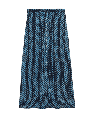 Pull on this printed midi skirt to complete your elegant ensemble. It has a regular fit, with a flattering A-line shape and an elasticated waist for comfortable wear. The button-down front finishes with a split at the hem for easy movement. n M&S Collection: easy-to-wear wardrobe staples that combine classic and contemporary styles.