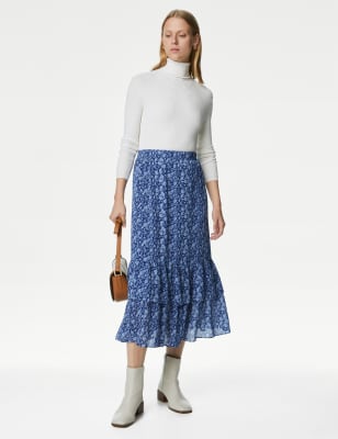 Create graceful warm weather outfits with this airy printed skirt. It's designed in an easy regular fit, with a flexible elasticated waistband for all-day comfort. This piece falls to a flowing midi length with ruffled tiers at the hem for a romantic finish.n M&S Collection: easy-to-wear wardrobe staples that combine classic and contemporary styles.