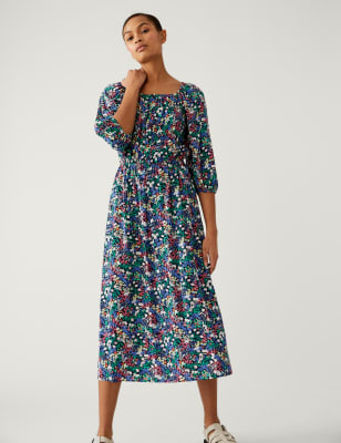 A pretty print brings a playful pop to this classic tea dress. It's cut in a regular fit with a versatile midi length. Gathers at the shoulders and square neck give a looser feel, while the full 3/4 length sleeves are gathered with elasticated cuffs. This piece fastens with a row of buttons at the front.n M&S Collection: easy-to-wear wardrobe staples that combine classic and contemporary styles.