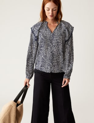 Ruffles over the shoulders give this printed blouse a striking silhouette. Regular fit, with a v-neck and long gathered sleeves for a touch of volume. Button fastening at the back for a neat finish.n M&S Collection: easy-to-wear wardrobe staples that combine classic and contemporary styles.
