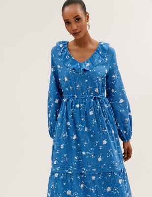 Bring a playful floral look to your wardrobe with this pure cotton midi dress. It has a regular fit with a self-tie belt at the elasticated waist for elegant shaping and is lined for comfort. The pintuck detailing and ruffled hem on the tiered skirt accentuate the fun feel. A delicate lace trim at the fluttery v-neck and long sleeves with gathered cuffs complete the dainty look. n M&S Collection: easy-to-wear wardrobe staples that combine classic and contemporary styles.