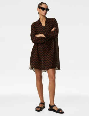 Womens M&S Collection Pure Cotton Printed Drawstring Beach Shirt - Conker, Conker