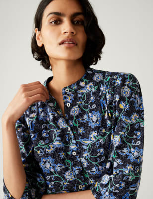 This printed blouse is crafted from pure cotton for a comfortable feel. It's designed in a regular fit, with gathers at the shoulders for a looser feel. The 3/4 length sleeves finish in elasticated cuffs for a touch of volume. Complete with a high neckline and button fastening at the front. M&S Collection: easy-to-wear wardrobe staples that combine classic and contemporary styles.