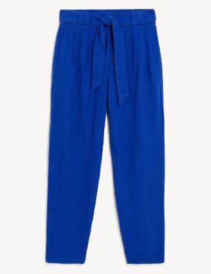 Enjoy a breezy feel with these trousers crafted from breathable pure linen. Tapered fit with an ankle-grazing length and mid-rise waist. A removable belt covers the comfy elasticated back waistband and concealed hook bar and zip fastening. Pleats at the front create volume through the leg. Complete with handy grown-on slanted pockets.n M&S Collection: easy-to-wear wardrobe staples that combine classic and contemporary styles.