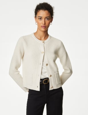 A textured knit and gold-tone buttons bring an elegant feel to this cardigan. It's designed in a comfortable regular fit, with a timeless crew neckline. Contrasting ribbed trims and patch pocket detailing complete the look.n M&S Collection: easy-to-wear wardrobe staples that combine classic and contemporary styles.