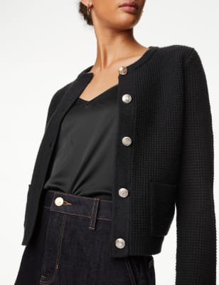 A textured knit and gold-tone buttons bring an elegant feel to this cardigan. It's designed in a comfortable regular fit, with a timeless crew neckline. Contrasting ribbed trims and patch pocket detailing complete the look.n M&S Collection: easy-to-wear wardrobe staples that combine classic and contemporary styles.