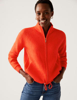 Womens M&S Collection Ribbed Funnel Neck Zip Up Cardigan - Flame, Flame