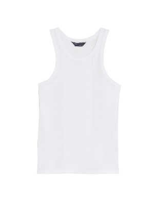 Pull on this ribbed vest top for casual looks. Fitted shape, with added stretch for comfort. Designed with a racer back to offer breathability. M&S Collection: easy-to-wear wardrobe staples that combine classic and contemporary styles.