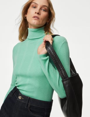 Stretchy ribbed material makes this knitted top super flattering. It's designed in a fitted shape, with slim long sleeves and a snug roll neck. Narrow ribbed trims at the cuffs and hem add a neat finishing touch. n M&S Collection: easy-to-wear wardrobe staples that combine classic and contemporary styles.