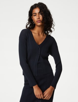 Add a sleek layer to outfits with this stylish cardigan. It's made to a fitted silhouette with a flattering v-neckline. The ribbed fabric provides subtle texture and an elongating effect. This piece fastens with two covered buttons at the front. A matching skirt is also available. n M&S Collection: easy-to-wear wardrobe staples that combine classic and contemporary styles.