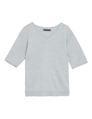 Complete your laid-back look with this v-neck top, knitted with breathable linen. It's cut in a relaxed fit, with ribbed fabric for a cosy texture. The short sleeves and stretchy hem create a neat finish. n M&S Collection: easy-to-wear wardrobe staples that combine classic and contemporary styles.