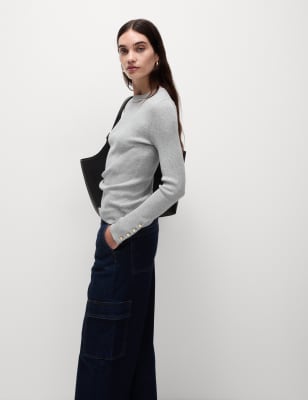 Womens M&S Collection Rippenpullover mit Rundhalsausschnitt und Knopfdetail - Grey, Grey