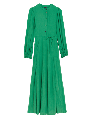 Easy and elegant, this maxi dress will be a wardrobe favourite. It has a regular fit, with belt at the waist to create flattering shaping. A button fastening beneath the round neck offers a smart look, while frill cuffs at the long sleeves create a fun final flourish. n M&S Collection: easy-to-wear wardrobe staples that combine classic and contemporary styles.