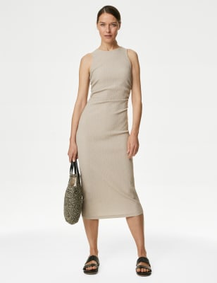 For special occasions, this elegant ruched dress is an ideal choice. It's cut in an effortless regular fit, with a flattering column shape and a timeless midi-length hem. The added stretch in the material ensures a comfortable feel. Its airy sleeveless design features an easy round neckline and a neat textured finish.n M&S Collection: easy-to-wear wardrobe staples that combine classic and contemporary styles.