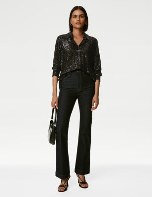 Womens M&S Collection Sequin Collared Shirt - Black, Black