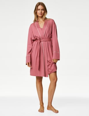 A cotton-modal blend makes this short dressing gown irresistibly soft. Easy regular fit, with a traditional wrap design and tie waist. Piped trims lend subtle contrast to the piece. Complete with Cool Comfort™ technology to help you feel cool and dry. n M&S Collection: versatile styles in modern shapes with unique and playful details.