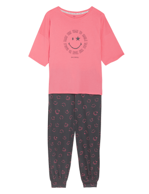 Bring extra playfulness to your nightwear with this SmileyWorld® pure cotton pyjama set. Comfortable regular fit, with an adjustable drawstring waist. The long bottoms feature an all-over print, while the short-sleeved top has an iconic Smiley face with a cheerful 'Time to smile' slogan. We only ever use responsibly sourced cotton for our clothes.n M&S Collection: versatile styles in modern shapes with unique and playful details.