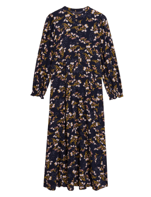 This floral maxi dress makes elegant dressing easy. It has a regular fit with a waisted middle for flattering shaping. Buttons run down from the round neck to offer a traditional look, while stretchy cuffs create a hint of volume in the long sleeves. n M&S Collection: easy-to-wear wardrobe staples that combine classic and contemporary styles.