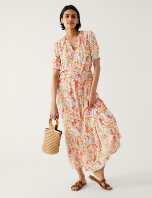 This printed waisted dress brings extra flair to your daywear. It's cut in a comfy regular fit, with a flirty keyhole front and a covered button fastening at the round neckline. The short sleeves are shirred at the cuffs to create on-trend volume, while the midaxi-length skirt is tiered for a full and floaty look. A tie at the elasticated waist adds a flattering finish.n M&S Collection: easy-to-wear wardrobe staples that combine classic and contemporary styles.