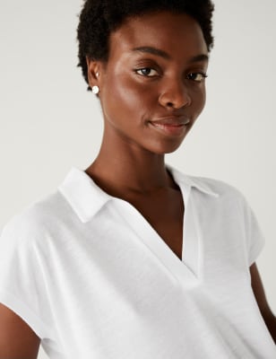 Woven with a touch of linen, this subtly textured top offers a crisp look and a cool hand feel. Regular fit, with breezy short sleeves. The v-neckline is finished with a smart collar.n M&S Collection: easy-to-wear wardrobe staples that combine classic and contemporary styles.
