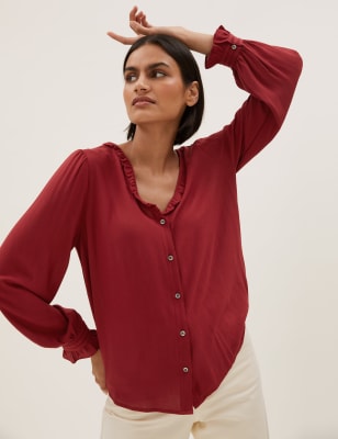 This feminine button-through blouse will take you from day-to-night with ease. Designed in an effortless relaxed fit, with a curved hem and frill detailing along the v-neckline and cuffs. Gathering at the shoulders gives the long sleeves gentle volume. M&S Collection: easy-to-wear wardrobe staples that combine classic and contemporary styles.
