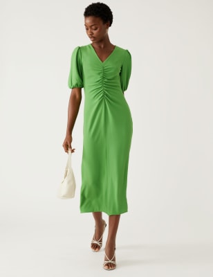 Womens M&S Collection V-Neck Ruched Midi Tea Dress - Green, Green