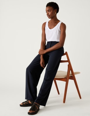 These woven trousers are the perfect mid-point between smart and laid-back dressing. Designed with flattering straight legs, they also feature a high waistband with a chic belt detail. Two side pockets carry your essentials. The pair fastens with a hook bar and zip.n M&S Collection: easy-to-wear wardrobe staples that combine classic and contemporary styles.