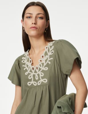 Womens Per Una Pure Cotton Embroidered V-Neck Shift Dress - Faded Khaki, Faded Khaki