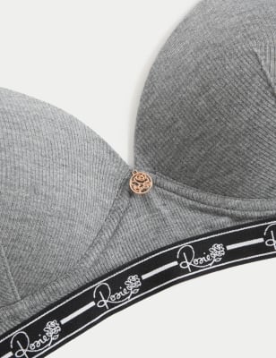 This ribbed lounge bra by Rosie Exclusively for M&S will elevate your downtime style. The plunging cups are non-wired for comfort and padded for a smooth look under clothes. French-designed floral lace on the wings combines with a logo-branded underband to create a sporty yet feminine feel. The bra is complete with exclusively designed signature rose gold hardware for a luxurious finish. Made with responsibly sourced viscose.Rosie: contemporary, feminine silhouettes crafted from luxurious fabrics with intricate detailing.