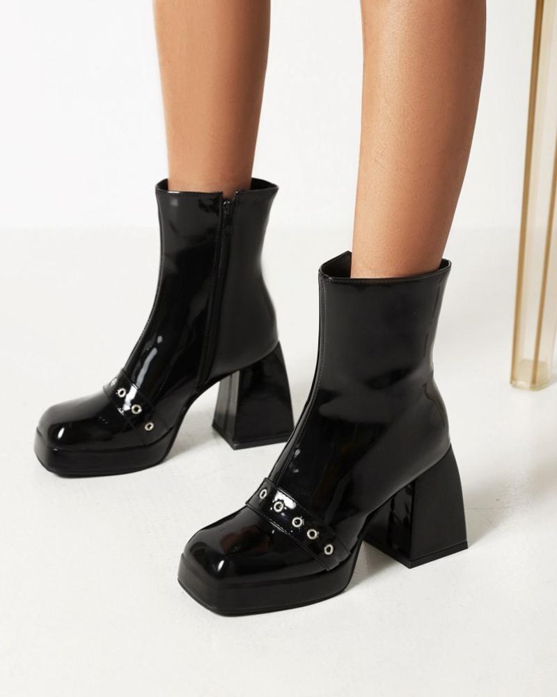 Womens Strap Decoration Square Toe Shiny Finish High Heel Boots, Black