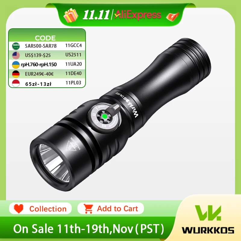 Wurkkos DL02 Professional Diving Flashlight 3000LM Work Light 21700 Battery Lamp Underwater Lantern with Rotary Magnetic Switch